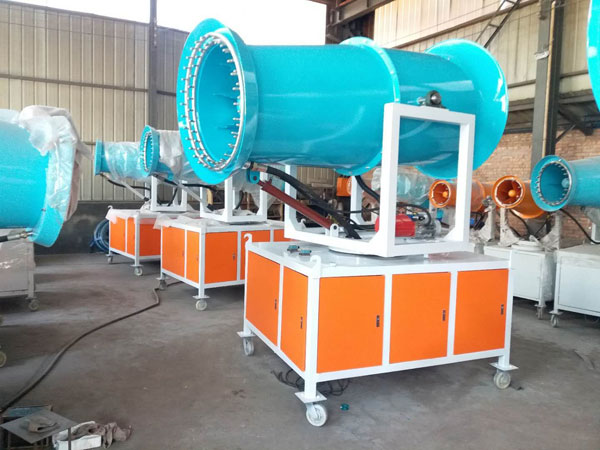 工地雾炮机是一种先进高效的工地降尘设备,雾炮机是工地远程喷雾降尘的重要设备。工地雾炮机一方面从风机吹出的高速气流将喷头雾化的雾滴进一步撞击、雾化成细小均匀的雾滴;另一方面强大的气流裹挟着雾滴吹向扬尘点,抑尘扬尘飘散。 风量是雾炮机较重要的技术参数之一,不仅承载着二次雾化的功能,还担负着确保射程的重